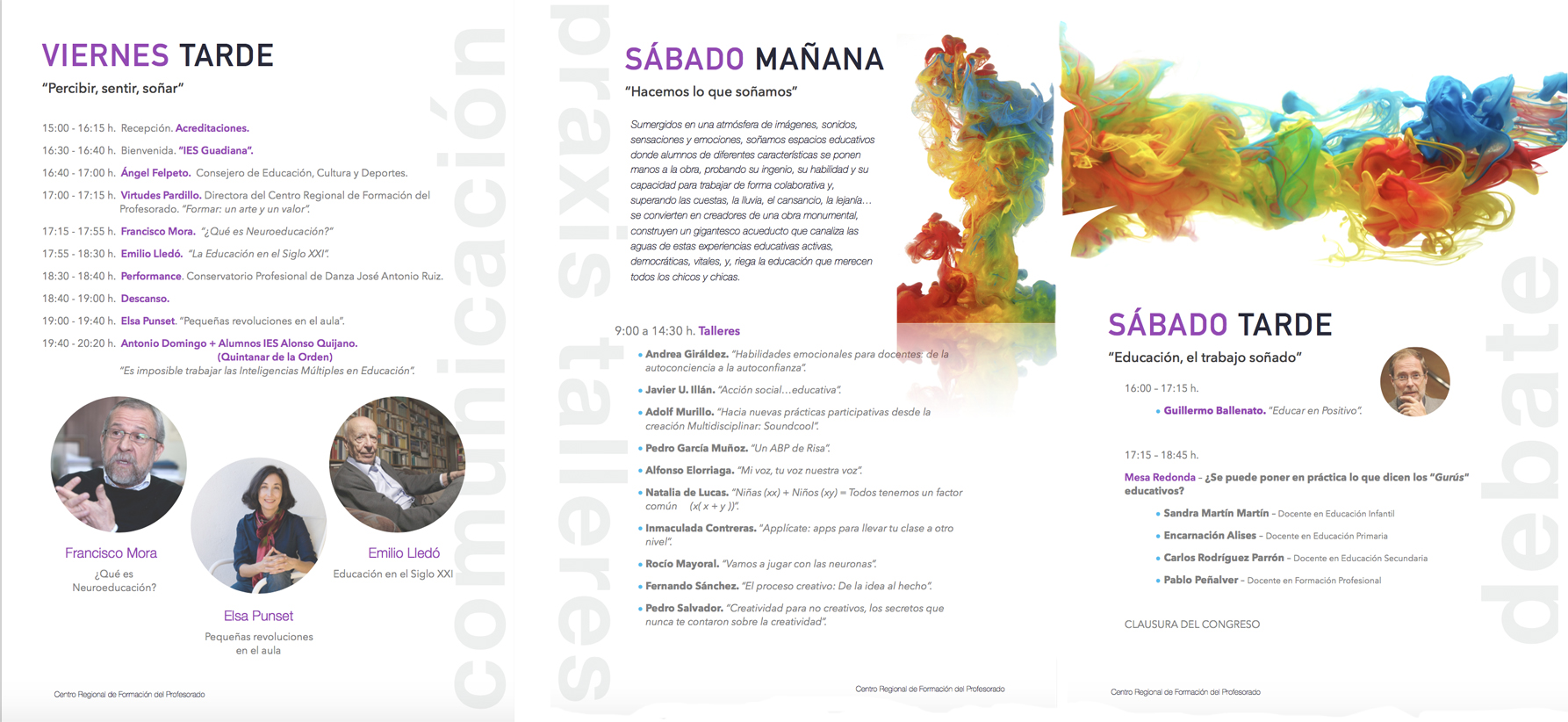 El Centro Regional de Formación del Profesorado promueve continuamente esta filosofía del proceso de enseñanza-aprendizaje y está en el espíritu de su oferta formativa. Para seguir por este camino y reforzar esa labor, el CRFP abre la convocatoria de su I Congreso en Educación que se celebrará en Toledo los próximos 9 y 10 de Junio de 2017. En este Congreso hablaremos y trabajaremos en alguno de los rasgos fundamentales que debe caracterizar a un docente en el siglo XXI como la Educación Emocional, la Neurociencia, las Inteligencias Múltiples o el cambio Metodológico a través de Ponencias y Talleres. Para este congreso contaremos con personalidades de la más alta relevancia educativa como Francisco Mora, Elsa Punset, Emilio Lledó o Guillermo Ballenato.