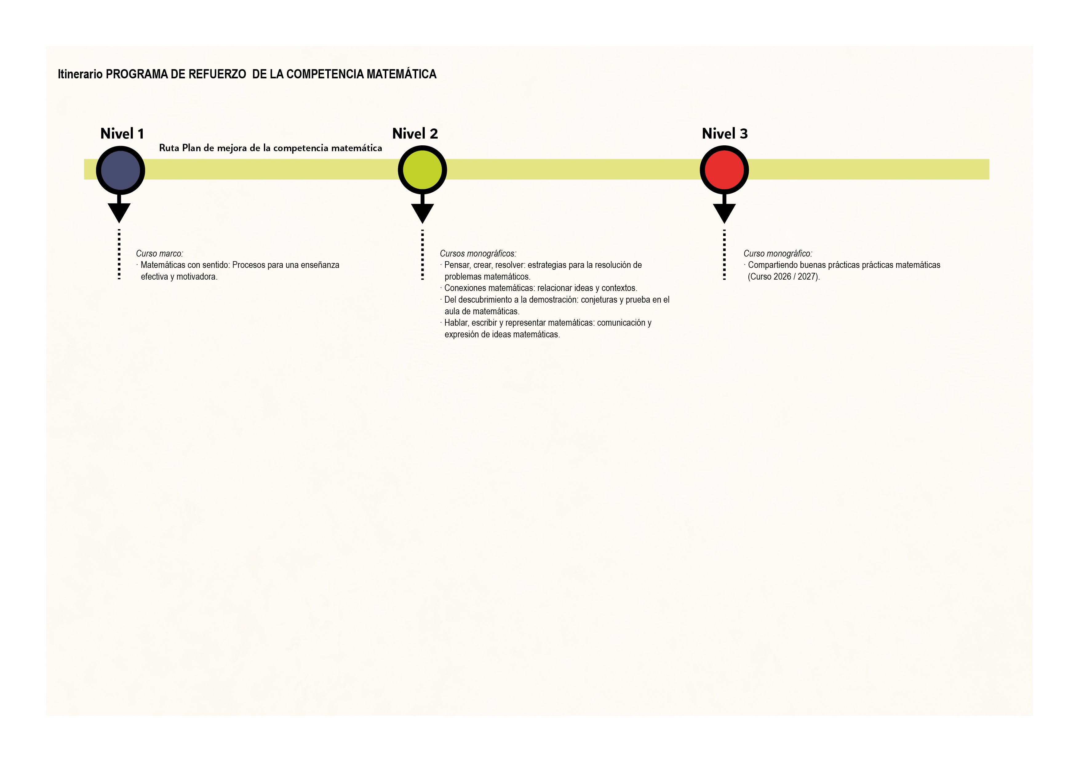Desde la Consejería de Educación, Cultura y Deportes ofertamos el itinerario formativo relacionado con “Plan de mejora de la competencia matemática” en donde los docentes tendrán la oportunidad de iniciar y completar una ruta formativa acorde a sus necesidades. Este itinerario tendrá una única ruta con diferentes cursos monográficos.