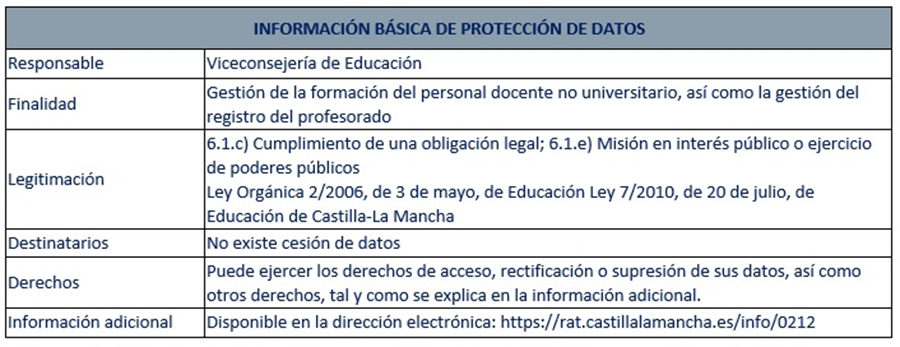 Mediante la inscripción en esta acción formativa se autoriza a la Administración educativa de Castilla-La Mancha a comprobar las actas, inscripción y certificación del Registro de Formación Permanente del Profesorado de Castilla-La Mancha.