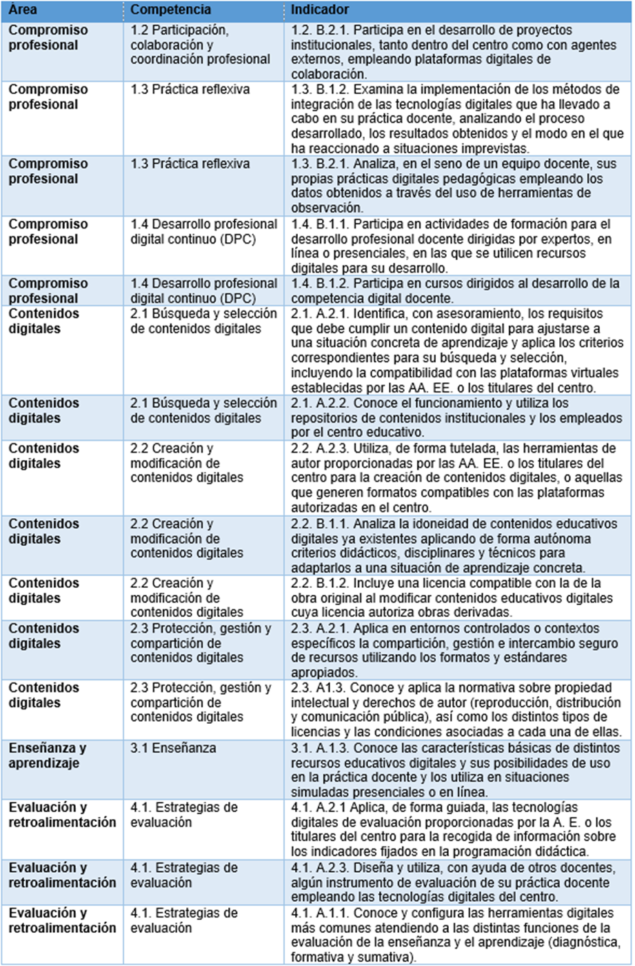 Áreas, competencias e indicadores del MCDD: