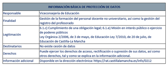 Mediante la inscripción en esta acción formativa se autoriza a la Administración educativa de Castilla-La Mancha a comprobar las actas, inscripción y certificación del Registro de Formación Permanente del Profesorado de Castilla-La Mancha.
