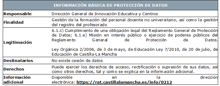 Mediante la inscripción en esta acción formativa se autoriza a la Administración educativa de Castilla-La Mancha a comprobar las actas, inscripción y certificación del Registro de Formación Permanente del Profesorado de Castilla-La Mancha.