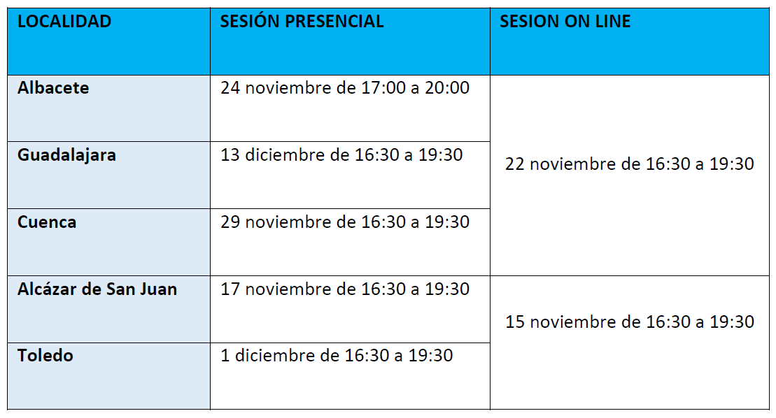 Si en algunas de las localidades no hay un mínimo de 10 participantes inscritos, no se celebrará la sesión presencial, pudiendo asistir, ese mínimo de participantes a otra localidad cercana.