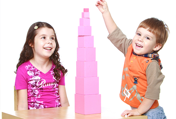 Área sensorial: presentación de los materiales más icónicos como la Torre Rosa y Escalera Marrón